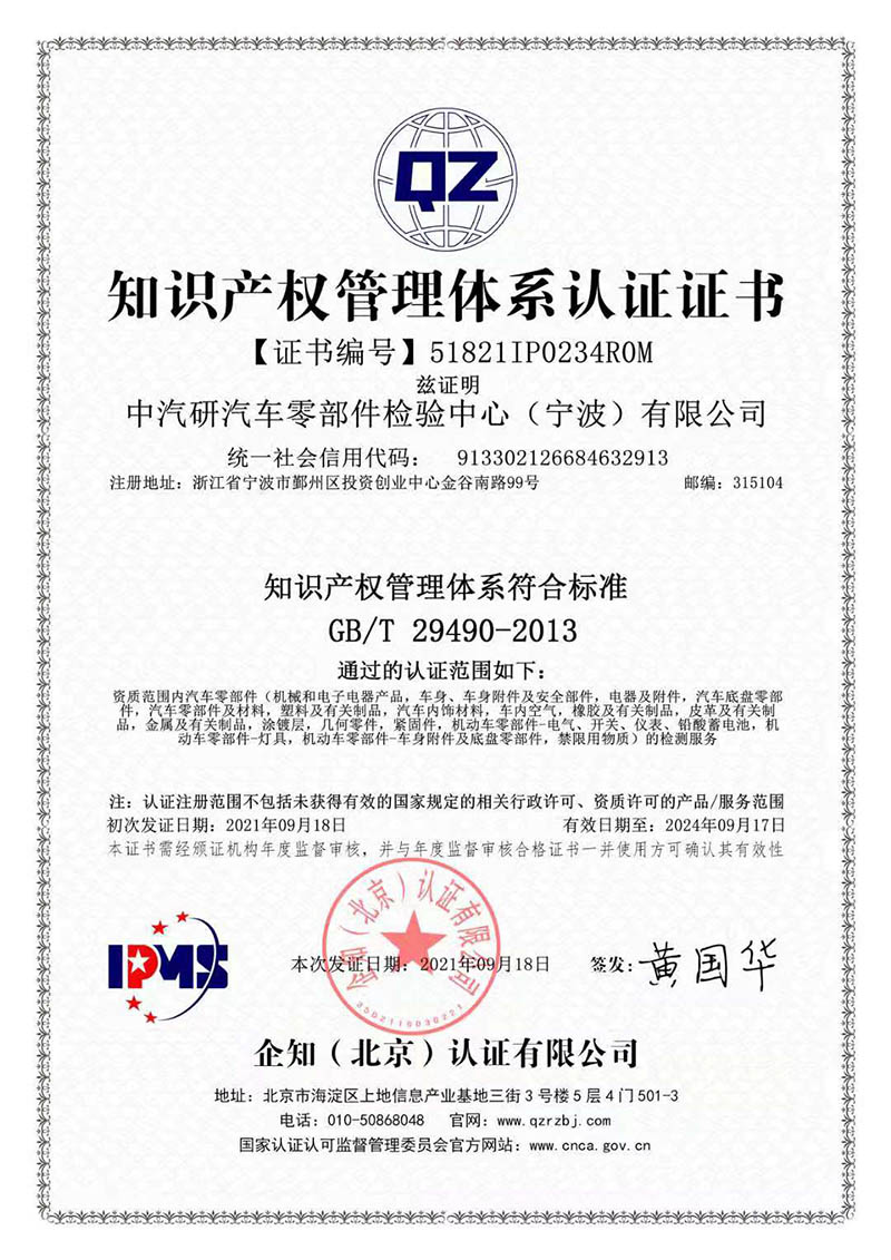 2021年9月22日,寧波檢驗中心下屬中汽研汽車檢驗中心(寧波)有限公司、中汽研汽車零部件檢驗中心(寧波)有限公司順利通過知識產權管理體系認證。
